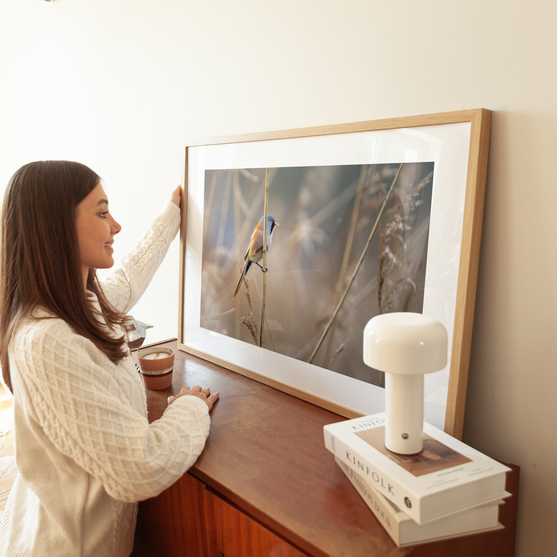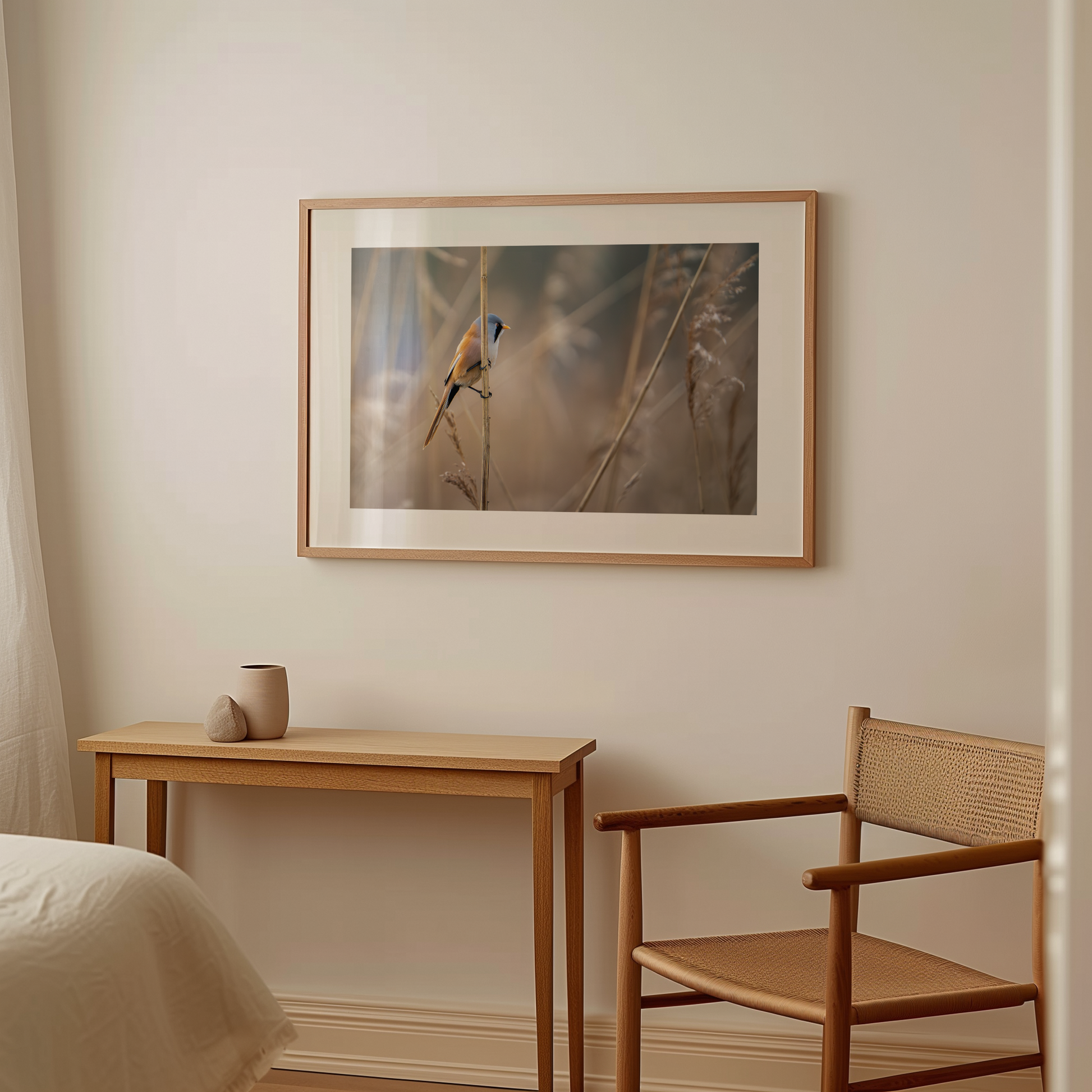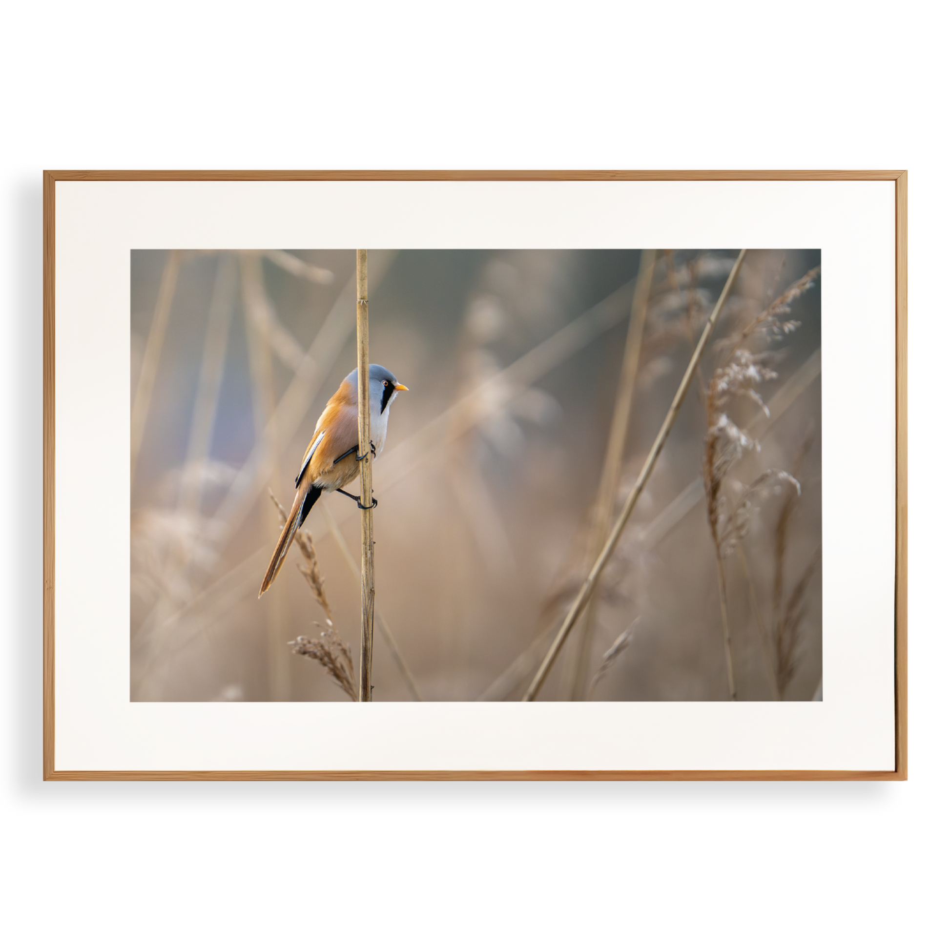 Haal de rust en schoonheid van de natuur in huis met deze verfijnde fotoprint van een baardman. Met zijn warme oranje borst en kenmerkende zwarte 'snor' zit hij stevig op een rietstengel, terwijl hij over de uitgestrekte rietvelden tuurt. Dit intieme moment vangt de essentie van zijn natuurlijke leefomgeving — kalm, maar vol leven.