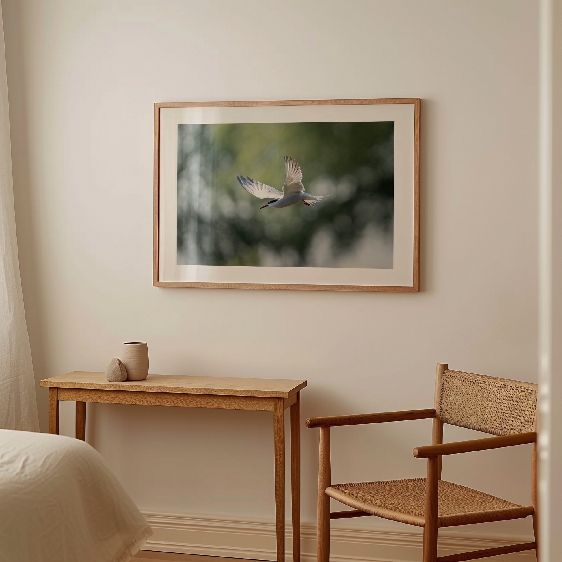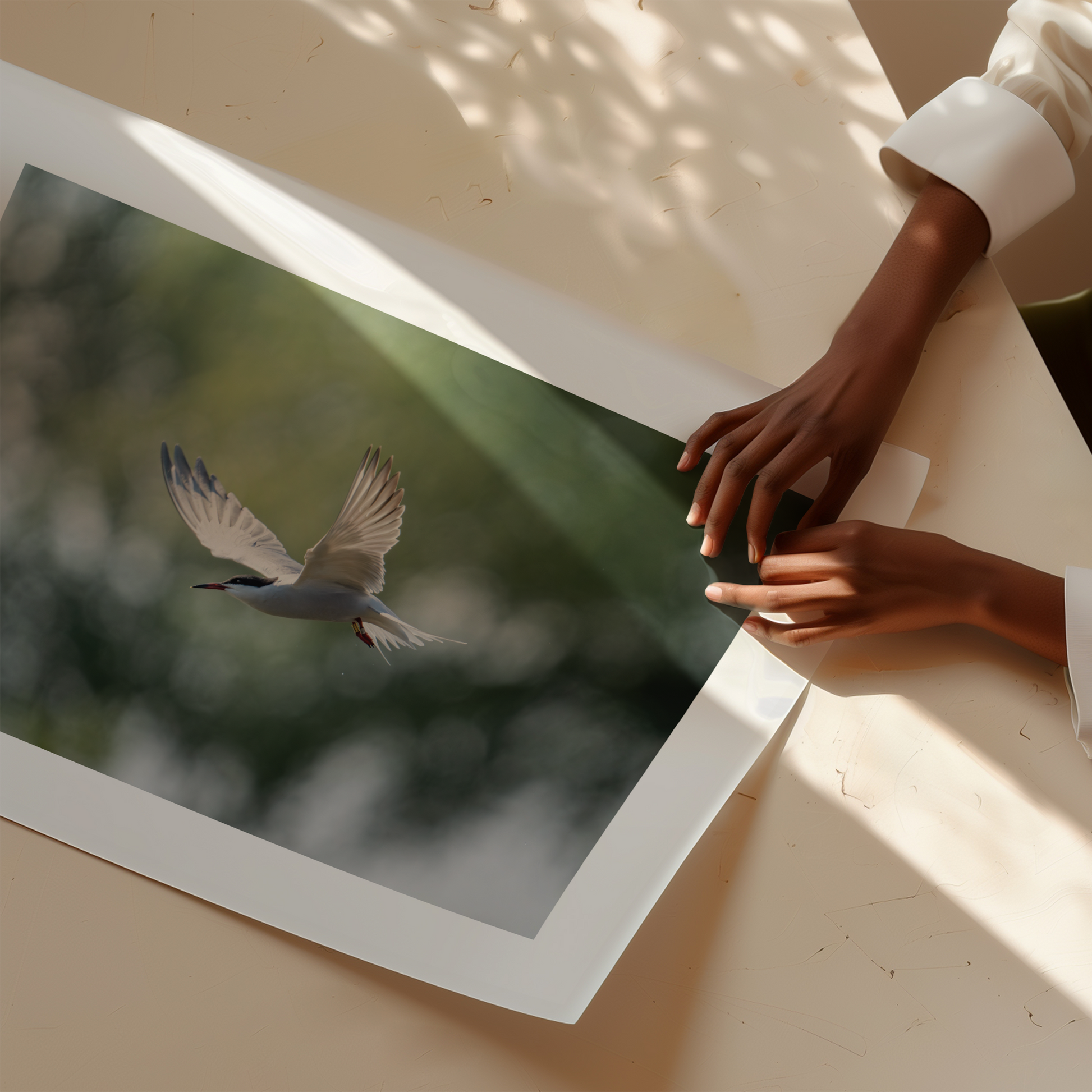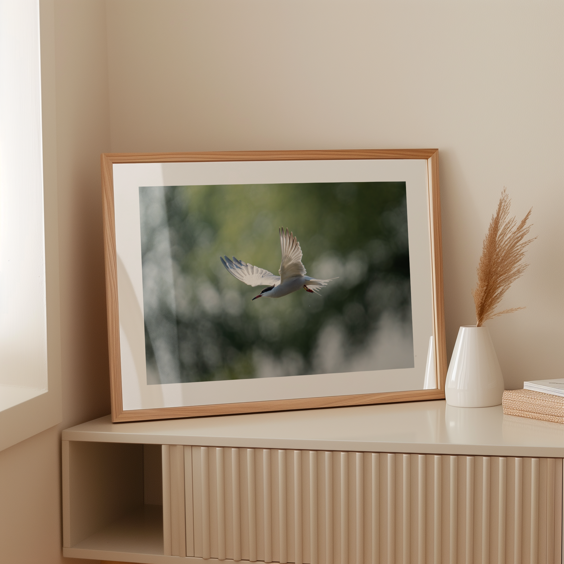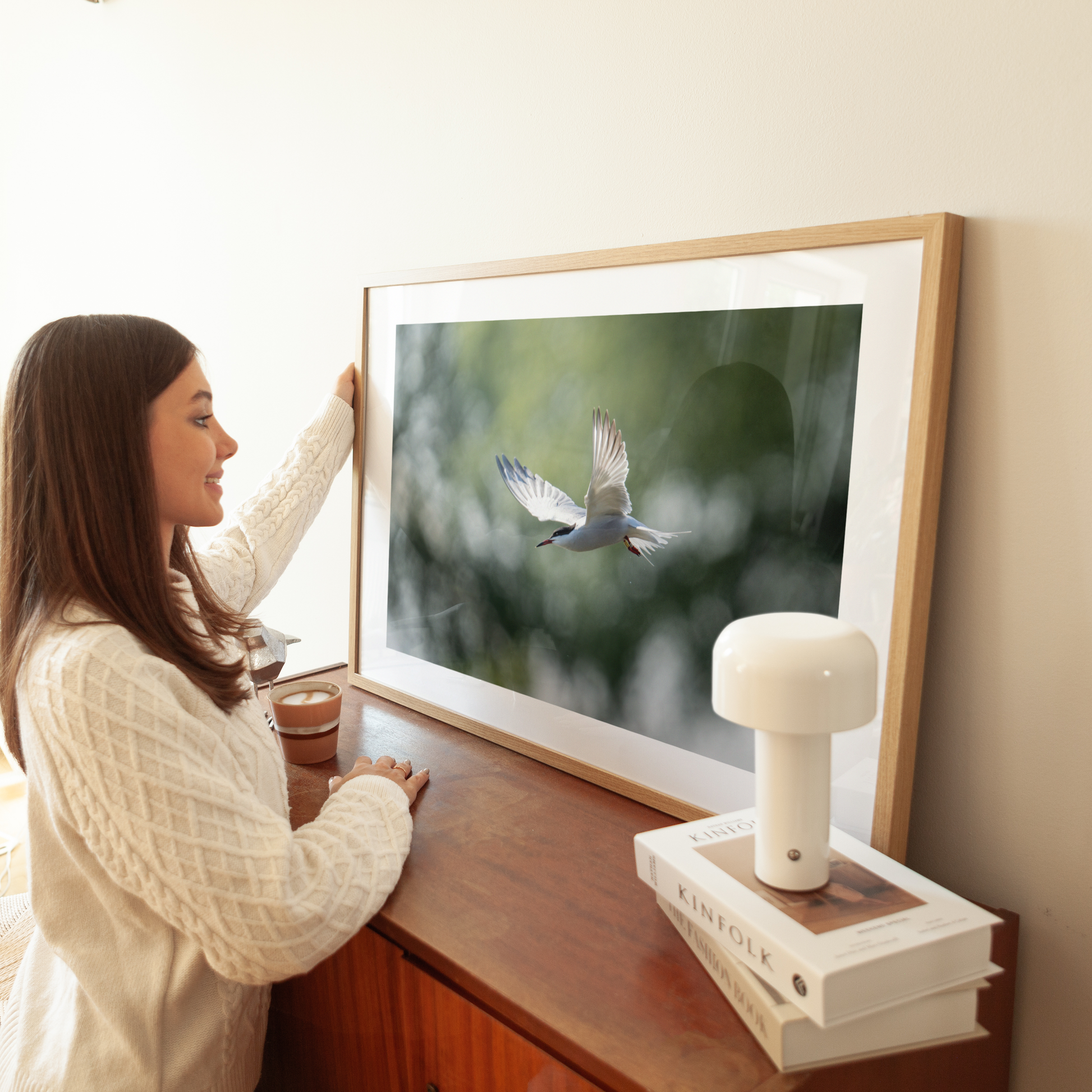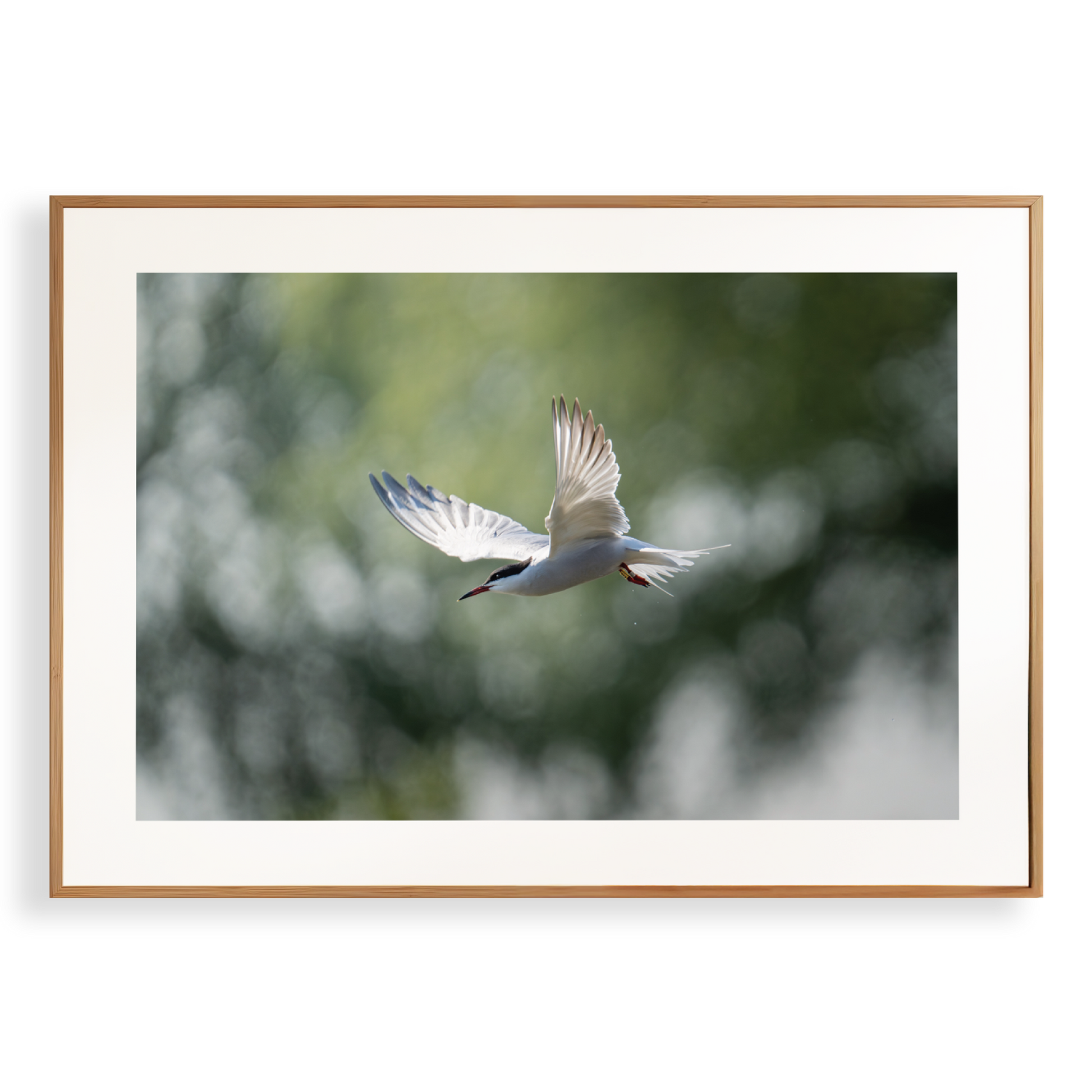 Breng elegantie en precisie in beeld met deze krachtige print van een visdief die zich naar het water stort. Met zijn slanke silhouet, lange vleugels en scherpe snavel is hij vastgelegd op het hoogtepunt van zijn duik — een moment vol focus en sierlijke snelheid.