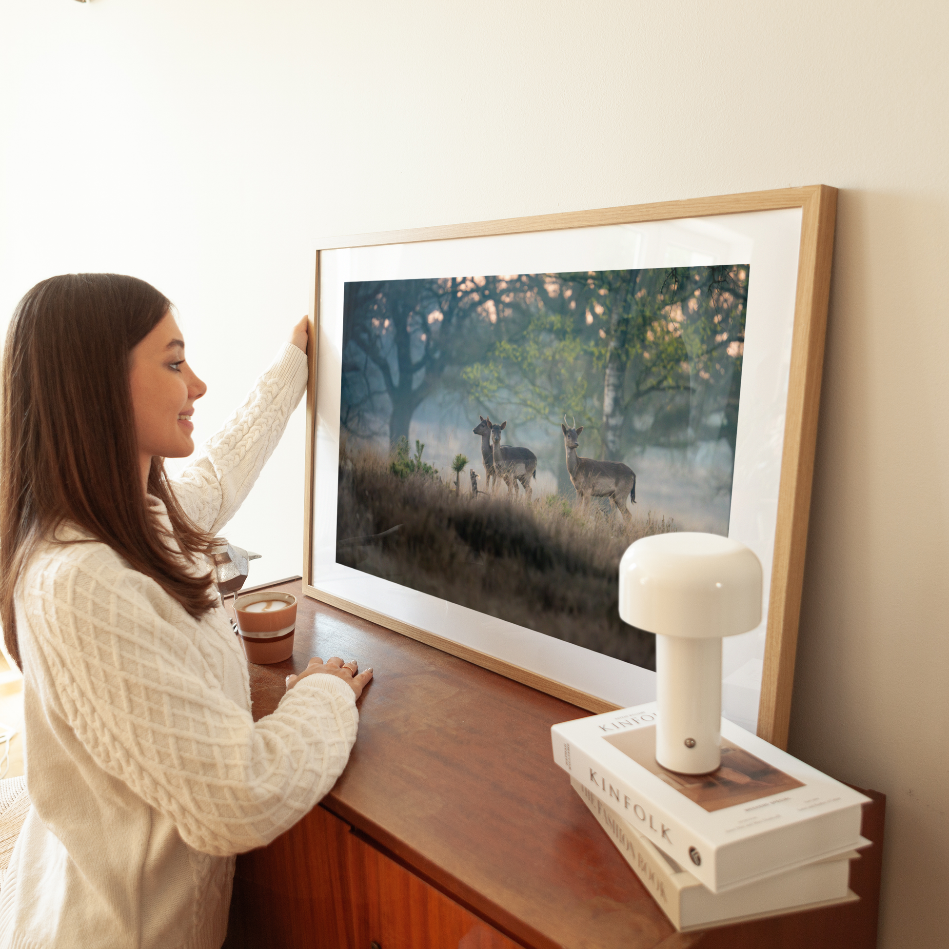 Breng een vleugje Veluwse magie in huis met deze serene print van twee reeën die rustig in het veld staan. Gevangen in het zachte ochtendlicht, met een vleugje mist om hen heen, straalt dit tafereel pure rust en schoonheid uit.